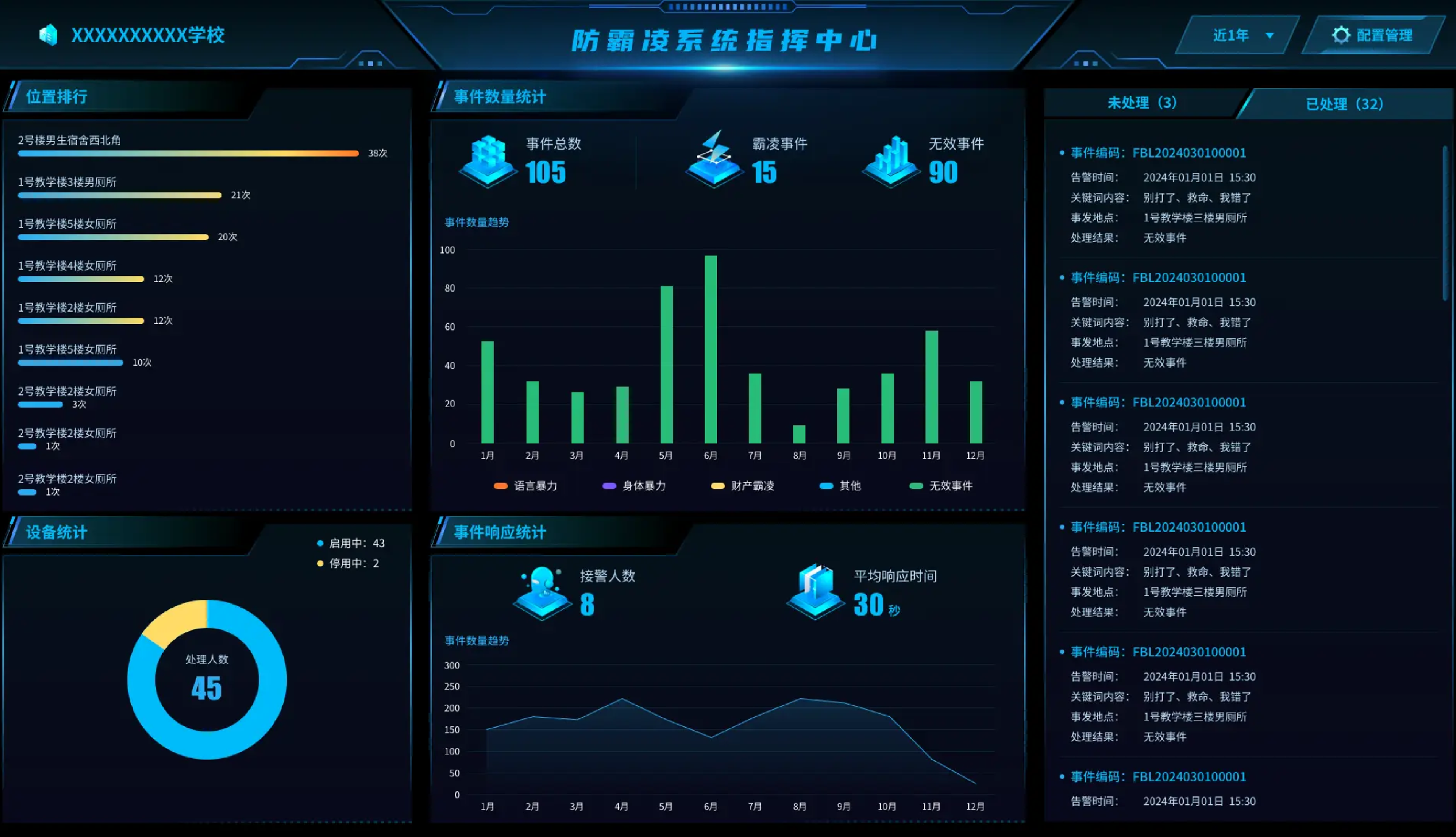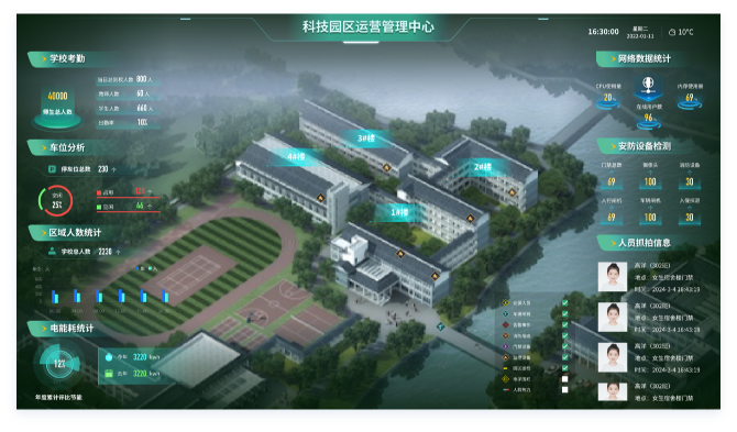 基于数据收集、存储、计算、分析、优化的过程同时形成各类管理数据展示,其中包括能耗数据、考勤数据、监控查询及数据、门禁数据等,还可以展示班级信息、多功能教室信息、各个监控点位、广播点位,并在未来进行接口开发,实现通过平台即可控制平台上显示的各类设备,形成校园内集中管理和物联控制的一体化生态。