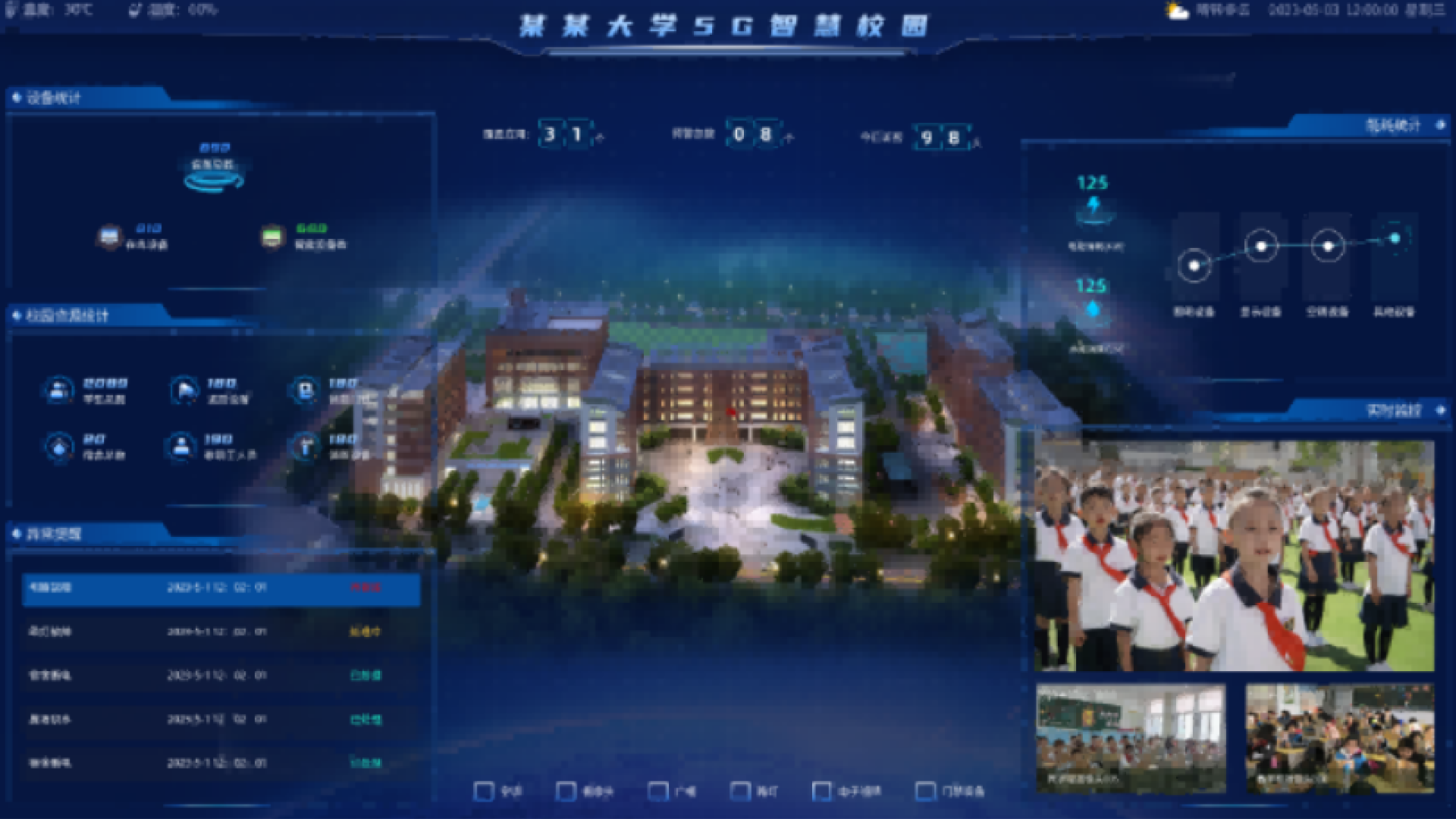 平台可对接校园内各类智能设备,高亮闪烁呈现故障设备,如监控、广播、电子班牌、灯光、空调等,可点击扫描周边摄像头、门禁设备,查看是否空置运行或报警状态,并进行远程控制